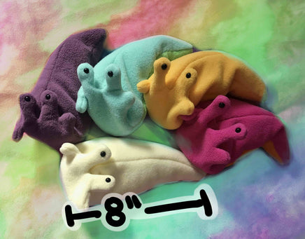 Mini slugs! These bad boys are 8" long and around 5" high. They are filled with 5-8 ounces of plastic beads for your weighted pleasure. They fit very comfortably in your hand to go on any adventure you'd like them to