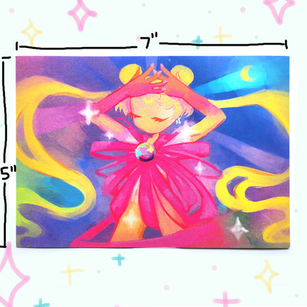 5" x 7" mini print on shiny pearl paper. Lil guy is sent in sturdy cardboard mailers and will be protected if ordered with other items :)